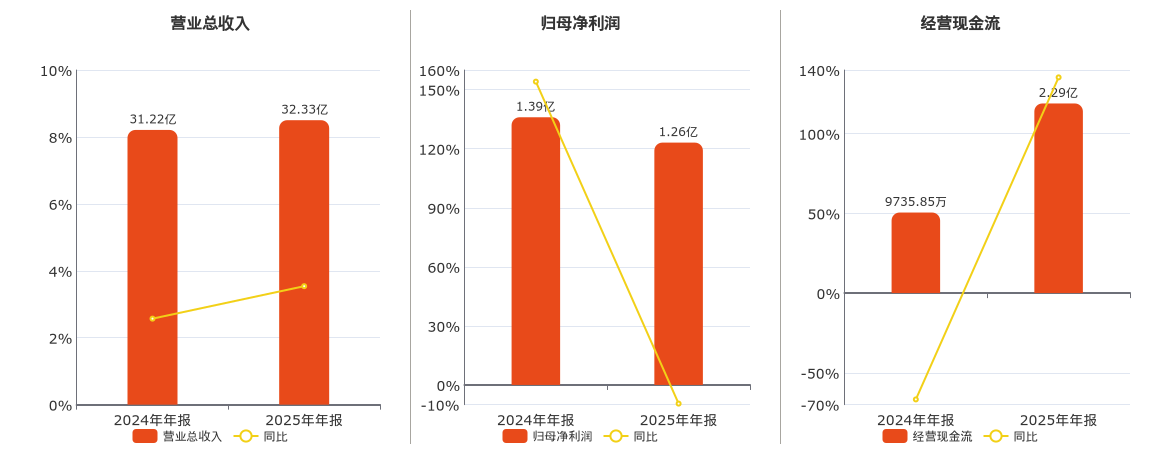 公司交易总收入为32.33亿元。归母净利润为1.26亿元,较客岁同默契期归母净利润减少1315.80万元,同相比客岁同时着落9.48%。策画动作现款净流入为2.29亿元。